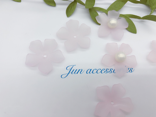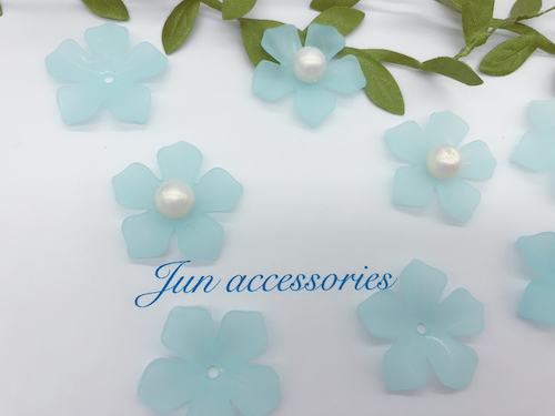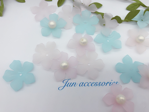 やや大きいメープルのアクリルフラワーです。花の中心部に通し穴があります。 パールは別売です。 ピンクとブルーの2色です。 サイズ:約27mm 販売単位:10個